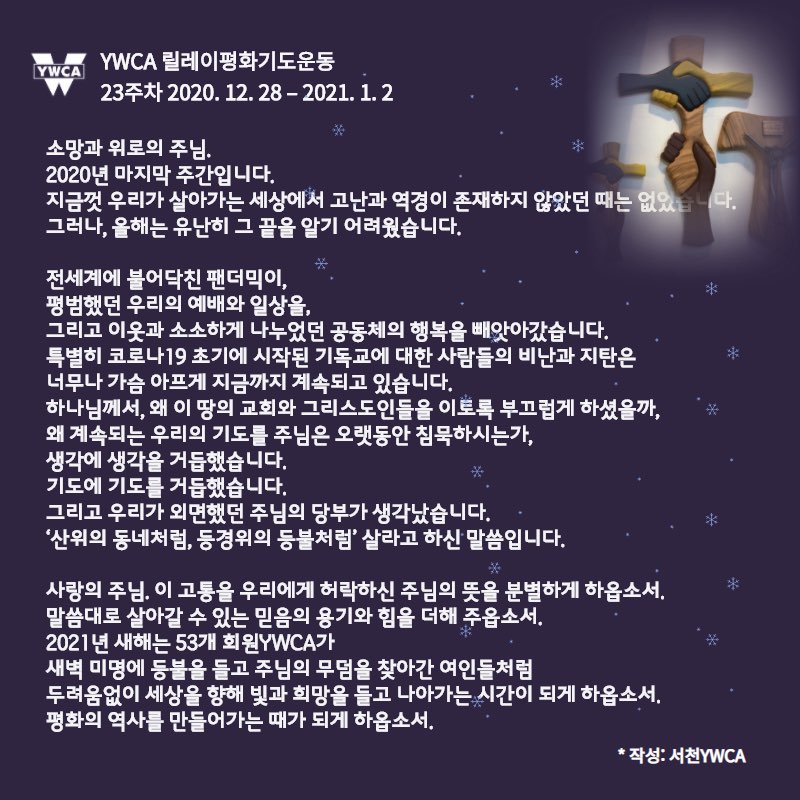 * 이번 주간 기도는 서천YWCA가 작성해주셨습니다.