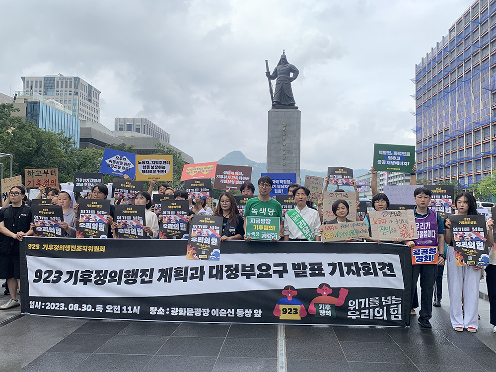 8월 30일 기자회견에서는 923 기후정의행진을 조직하는 이유와 준비 사항에 대해 소개됐다. 또한 반빈곤, 탈핵, 철도 공공성, 새만금 신공항 반대 등의 쟁점을 가지고 싸우고 있는 다양한 단체·조직 활동가들이 왜 행진에 참여하는가에 대해 발언했다. 마지막으로 기자회견문 낭독이 이뤄졌다.