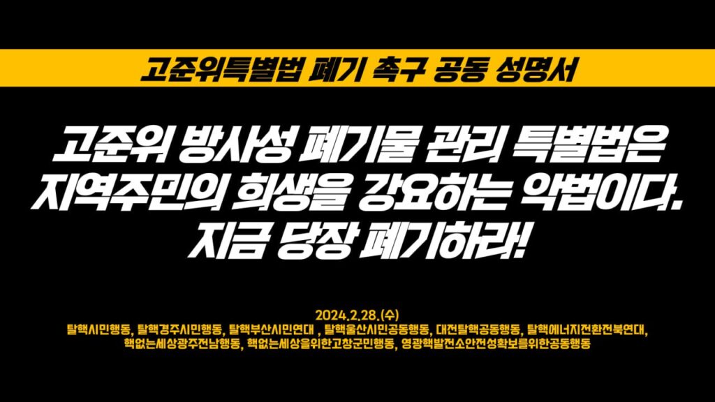 [공동성명서] 고준위 방사성 폐기물 관리 특별법은 지역주민의 희생을 강요하는 악법이다. 지금 당장 폐기하라! 2024.02.28