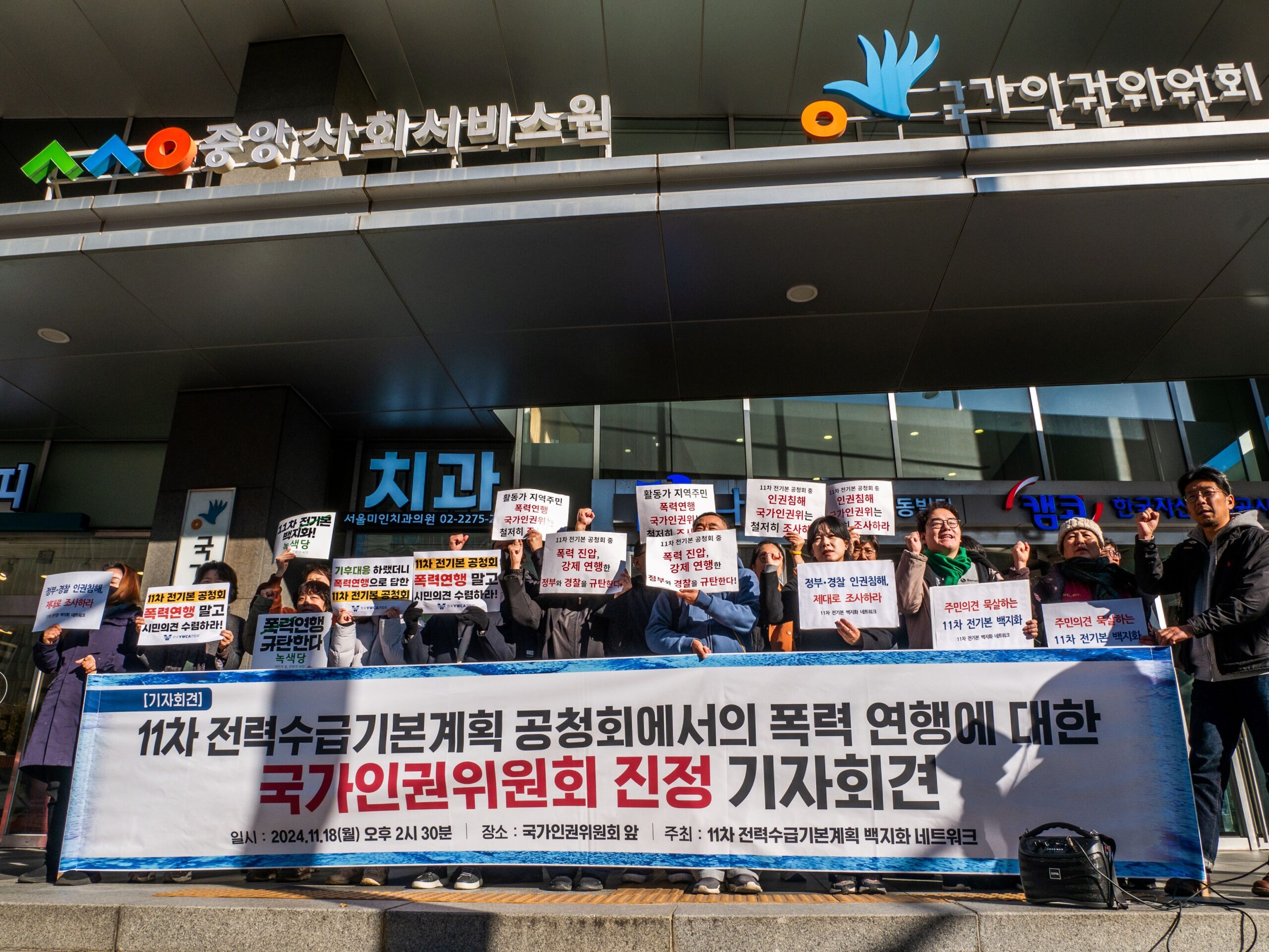11월 18일(월), 11차 전력수급기본계획 백지화 네트워크는 <11차 전기본 공청회에서의 폭력 연행>에 대한 기자회견을 개최하고, 국가인권위원회에 인권침해 진정서를 접수했다. 11차 전기본은 향후 15년 간 전력 수요를 전망해 발전소와 송변전 시설의 공급 계획을 수립하는 전력계획이다.