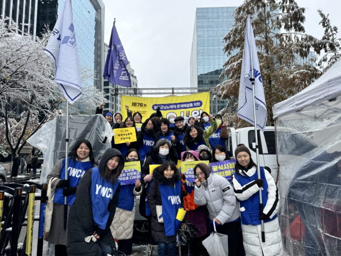 11월 27일(수), 세계여성폭력추방주간을 맞아 한국YWCA연합회 주관으로 일본군성노예제 문제 해결을 위한 제1676차 정기 수요시위가 열렸다. 궂은 날씨 속에서도 한국YWCA연합회의 자원활동가와 실무활동가 30여명이 참여해 일본군성노예제 문제 해결과 여성 인권 회복을 위한 목소리를 높였다.