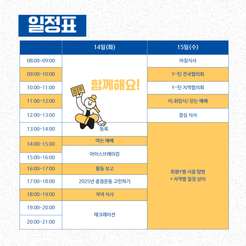 한국YWCA 청소년 회원인 Y-틴이 25년 1월 14일(화) ~ 15일(수) 하이서울유스호스텔에서 ‘2025 Y-틴 전국협의회’를 개최한다. 이번 협의회에서는 2024년의 운동을 정리하고 2025년의 중점운동 주제를 선정한다.