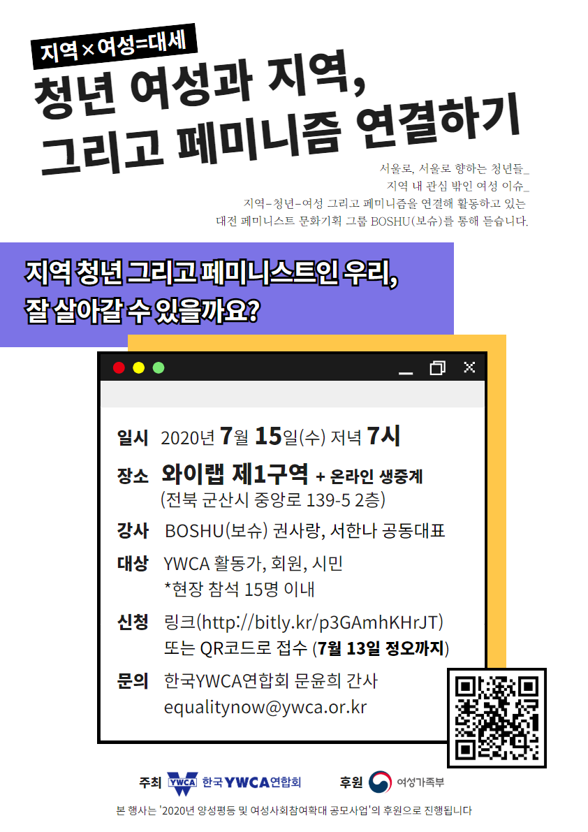 청년이 지역을 떠나는 ‘서울공화국’의 현실 속에서 청년 여성이자 페미니스트로 지역에서 어떻게 ‘잘’ 살아가고, 살아내고 있는지 대전 페미니스트 문화기획그룹 ‘BOSHU’(보슈) 권사랑, 서한나 공동대표가 이들의 활동을 중심으로 이야기를 전한다. 온라인 회의로 동시 진행하는 이날, 사전 접수한 질문을 포함한 실시간 질의응답, 참가자와 여성운동 활동가들의 고민 등도 함께 나눈다.
