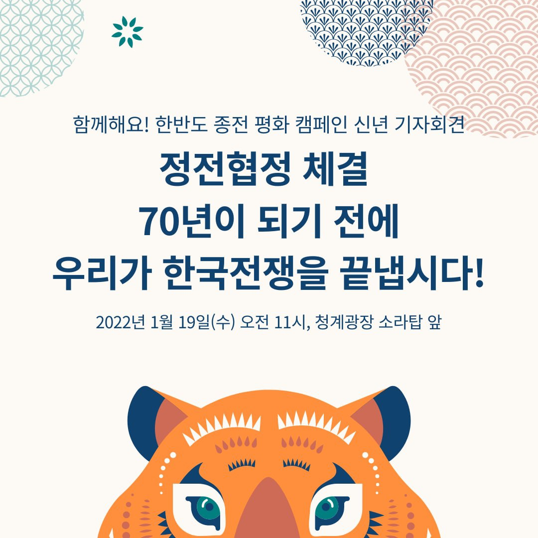 이에 한반도 종전 평화 캠페인은 내년 정전협정 체결 70년이 되기 전 한국전쟁을 종식하여 적대와 불신, 신냉전 구도를 걷어내고 화해와 협력의 길로 나아갈 것을 촉구하는 신년 기자회견 <정전협정 체결 70년이 되기 전에 우리가 한국전쟁을 끝냅시다!>를 아래와 같이 개최합니다. 더불어 올해 대통령 선거를 앞두고 모든 후보들이 한반도 종전과 평화를 위한 행동에 적극적으로 나설 것을 강력히 촉구할 예정입니다. 기자회견에서는 각계 발언을 비롯하여 ‘2022년 한반도 종전과 평화’를 기원하는 박 터트리기 퍼포먼스가 진행될 예정입니다.