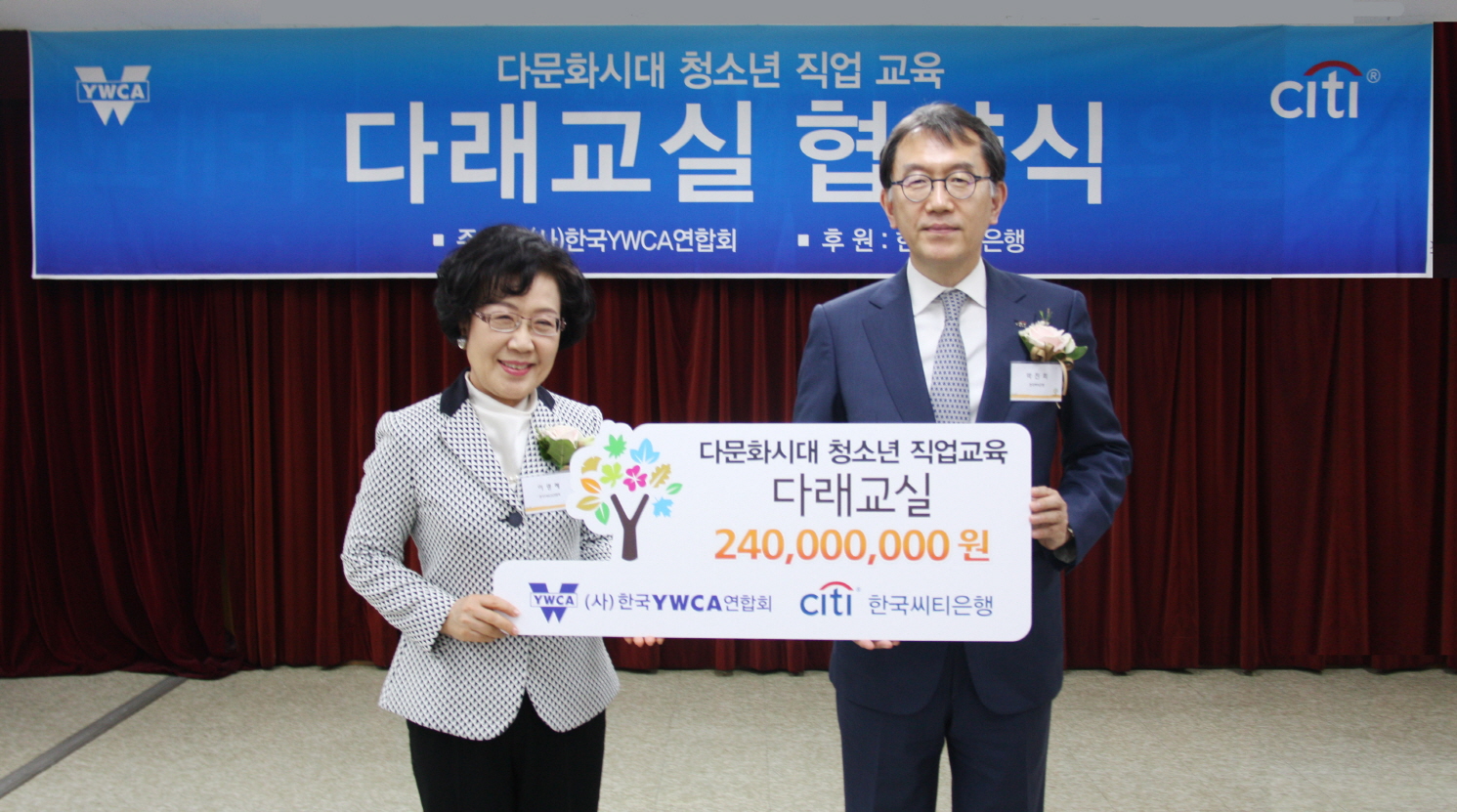 한국YWCA연합회(회장 이명혜)는 한국씨티은행(은행장 박진회)과 3월 23일 서울 명동 한국YWCA연합회 강당에서 다문화청소년 직업교육 프로그램 <다래교실> 협약식을 열고, 20만 달러(2억 4천만원 상당)의 후원금을 전달받았다.