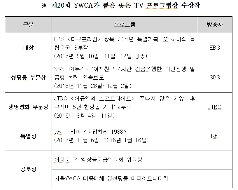제20회 ‘YWCA가 뽑은 좋은 TV프로그램상’ 시상식 개최