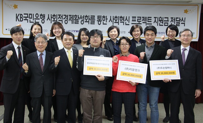 KB국민은행(은행장 윤종규)이 주최하고 사회적기업활성화지원센터(이사장 안재웅)와 한국사회적기업진흥원(원장 오광성)이 공동주관하는 ‘KB국민은행 사회적경제 활성화를 위한 사회혁신 프로젝트’는 첫 지원대상으로 3개 기업을 최종 선정하고, 11월 25일(금) 오후 2시 서울 명동 한국YWCA연합회 강당에서 지원금을 전달했다.