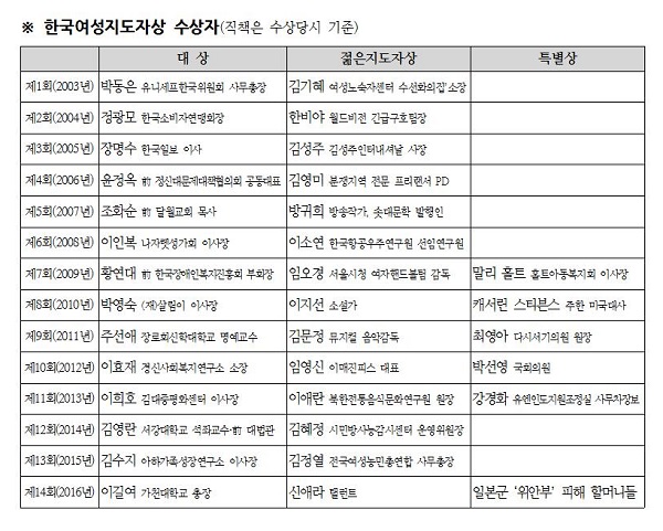 이희호 김대중평화센터 이사장, 김영란 前 대법관, 이효재 경신사회복지연구소 소장, 故 박영숙 前 여성재단 이사장, 윤정옥 前 정신대문제대책협의회 공동대표, 故 정광모 前 한국소비자연맹 회장 등이 대상을 받았으며 한비야 월드비전 긴급구호팀장, 이지선 <지선아, 사랑해> 저자, 김문정 뮤지컬 음악감독, 김영미 분쟁지역 전문PD, 임영신 이매진피스 대표, 김정열 전국여성농민회총연합 사무총장, 김혜정 시민방사능감시센터 운영위원장 등이 젊은지도자상을 받았다. 특별상은 강경화 외교부 장관, 캐슬린 스티븐스 주한 미국대사 등이 받았다.