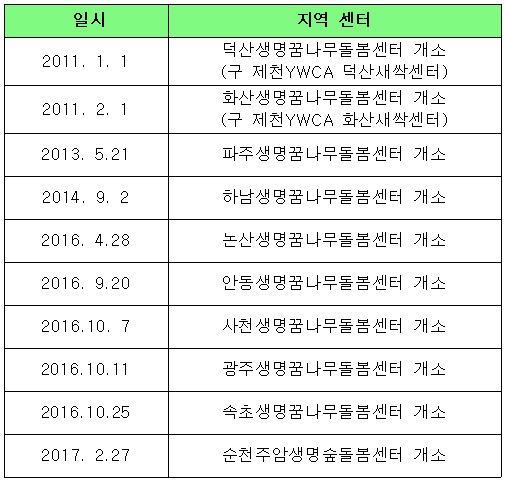 YWCA와 생명보험사회공헌재단이 2011년부터 개설해 운영하고 있는 생명꿈나무돌봄센터는 제천(덕산, 화산), 파주, 하남, 논산, 안동, 광주시 광산구, 사천, 속초 등 9개이다. 2017년 생명숲돌봄센터로 이름을 바꾼 순천주암면 센터가 10번째로 문을 열었다.