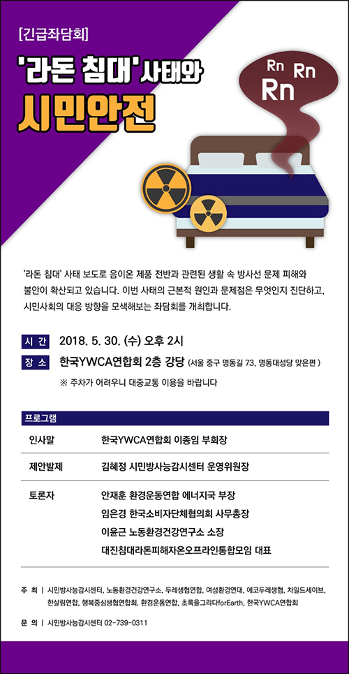 넘쳐나는 방사능 제품 속에서 시민불안이 가중되고 있지만 정부대책 미봉책에 그치고 있습니다. 이에 시민사회단체는 소비자단체와 라돈침대 피해자들과 함께 음이온 생활제품 실태와 라돈 외의 천연방사성물질 피폭에 의한 영향, 그리고 정부 정책의 문제점과 해결방안 등을 살펴보고자 합니다.