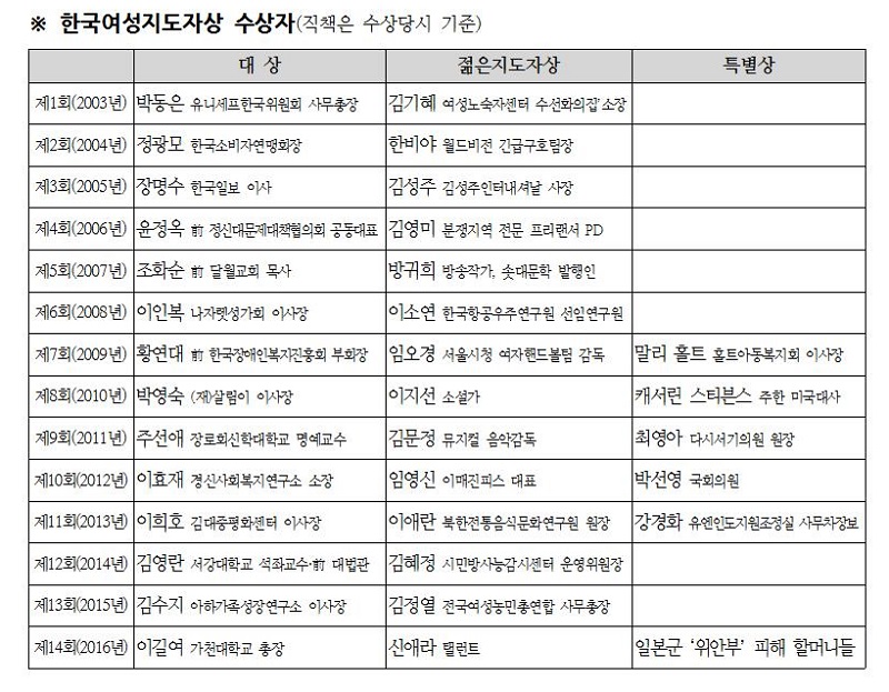 한국YWCA와 한국씨티은행은 11월 2일(목) 서울시 중구 전국은행연합회관에서 제15회 한국여성지도자상 시상식을 열어 최영애 여성인권을지원하는사람들 이사장에게 대상을, 이미영 페어트레이드코리아 대표에게 젊은지도자상을 각각 수여했다. 특별상은 올해 시상하지 않는다.