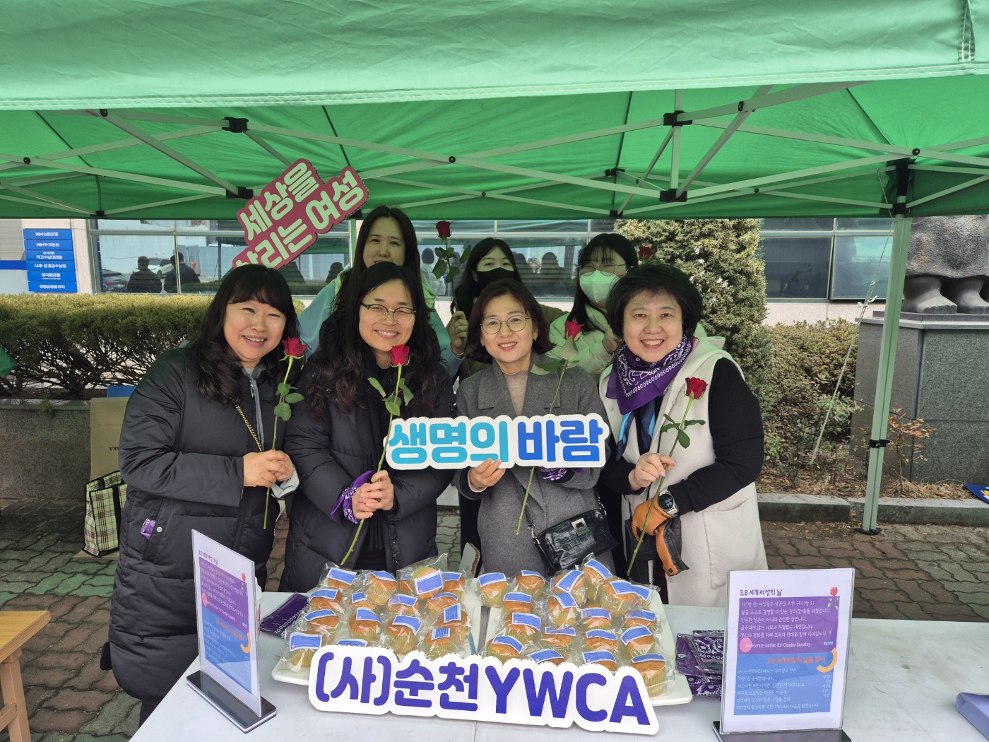 3월 8일(토) 국민은행 사거리에서 열린 ‘3·8 세계 여성의 날과 함께하는 제 20차 순천시민 촛불 광장’ 에서 지금, 우리가 바라는 세상을 위해 순천YWCA는 117년 전 생존을 위한 권리를 위해 투쟁했던 여성들의 마음을 담아 지역의 안전한 먹거리로 만든 ‘머핀’을 나누었고, 순천YWCA합창단은 성평등한 세상, 모두가 안전한 세상, 차별과 혐오가 없는 세상, 포용과 연대로 나아가는 세상을 위해 ‘바람의 빛깔,Heal the world’ 를 노래하였다.