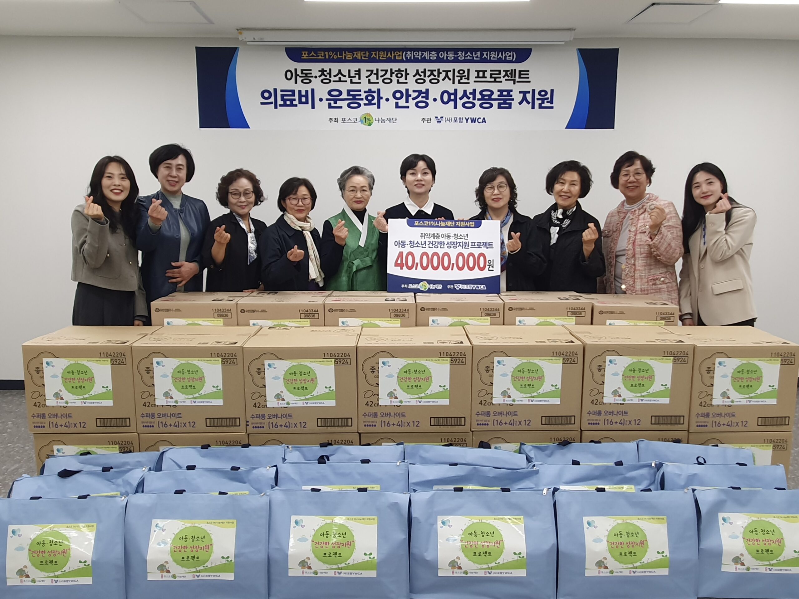포항YWCA는 4월 23일(수) Y회관에서 포스코1 % 나눔재단 지원사업 사업비 전달식을 진행했다. 전달받은 지원금은 취약계층 가정 아동·청소년 320명에게 의료비, 운동화, 여성용품(속옷, 생리대), 안경 등 생활에 필요한 물품을 지원하여 아동·청소년들이 신체활동, 학습활동, 일상생활 등에 불편함을 겪지 않고 건강한 생활을 지원하고자 “아동·청소년 건강한 성장지원 프로젝트”를 진행했다. 병원 검사비·치료비, 약제비 등을 지원하여 건강 불균형 해소 및 건강한 성장을 도모하며 생리대 지원, 새학기 운동화 지원, 안경 구입 및 교체 기회를 제공했다.