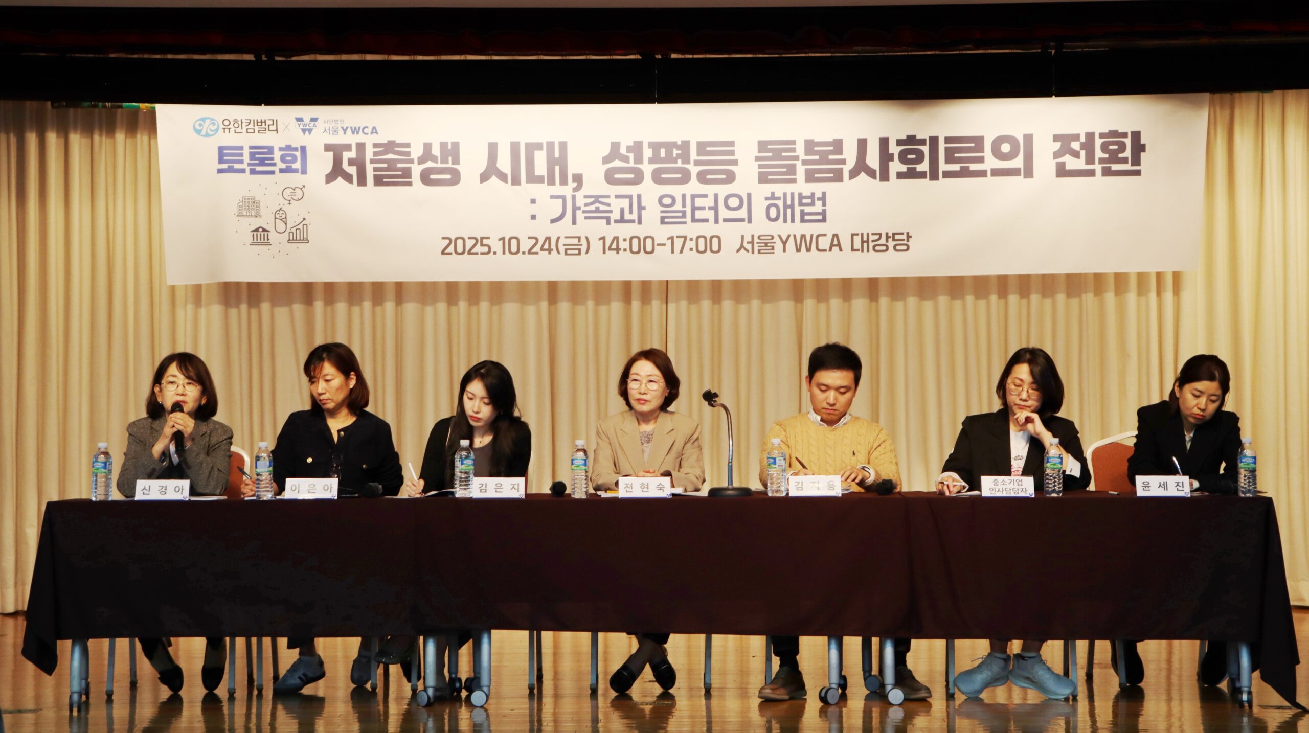 서울YWCA는 ‘일·가정 양립’과 ‘성평등 돌봄사회’를 주제로 한 토론회 「저출생 시대, 성평등 돌봄사회로의 전환-가족과 일터의 해법」을 10월 24일(금) 회관 대강당에서 개최했다. 관련 연구를 수행한 신경아 교수(한림대 사회학과)와 이은아 교수(이화여대 여성학과)의 연구 결과 발표를 시작으로 신혼부부 여성과 남성 당사자의 목소리도 직접 듣는 시간을 마련했다. 발제자와 중소기업 인사담당자, 정부 관계자도 참여해 시민과 함께 정책 토론을 이어나가며, ‘저출생의 덫’에서 벗어나려면, 육아휴직 사용 의무화·난임휴직 도입·노동시간 단축 등 실질적인 돌봄사회로의 시스템 전환이 급선무라는데 의견을 모았다.
