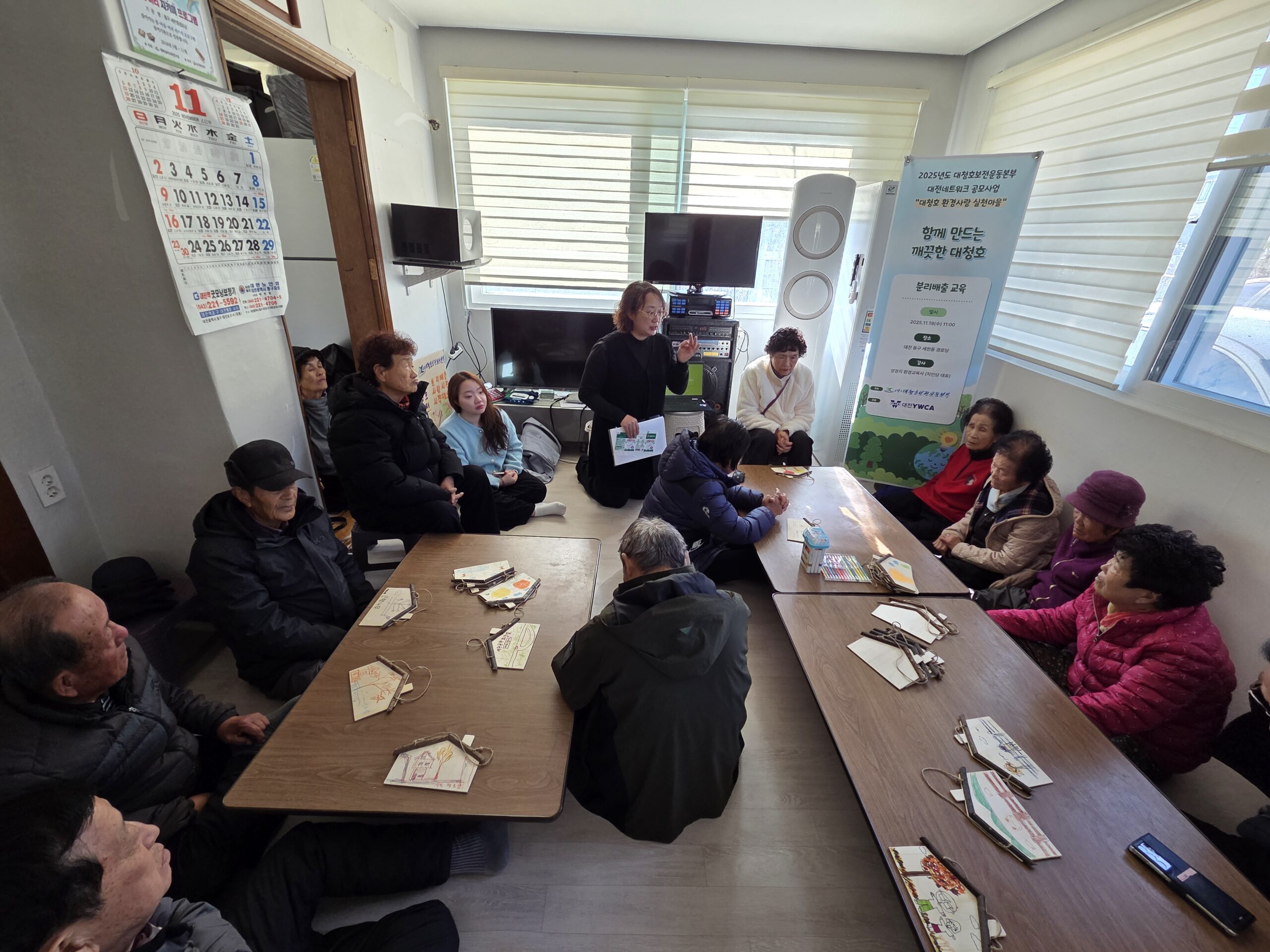 대전YWCA는 11월 19일(수), 대전시 동구 세천동 경로당에서 세천동 주민 16명을 대상으로 분리배출 환경교육을 진행하였다. 교육은 우리가 지켜야 할 대청호의 자연을 떠올려보자는 의미에서 ‘우리가 좋아하는 대청호 그리기’ 활동으로 시작하였다. 주민들은 자주 찾는 곳의 모습을 그림으로 표현하며 대청호의 자연환경을 다시 생각해보는 시간을 가졌다.